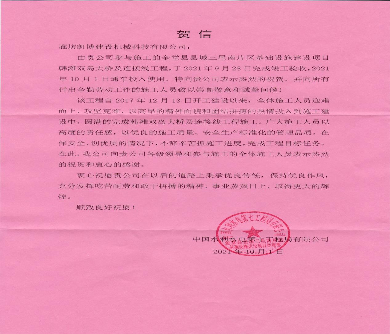 中國(guó)水電七局邀請(qǐng)我公司參加了金堂大橋的通車儀式、贈(zèng)送紀(jì)念品,并專門發(fā)來(lái)賀信,對(duì)我公司在項(xiàng)目合作中的支持配合與辛勤付出表示衷心感謝。